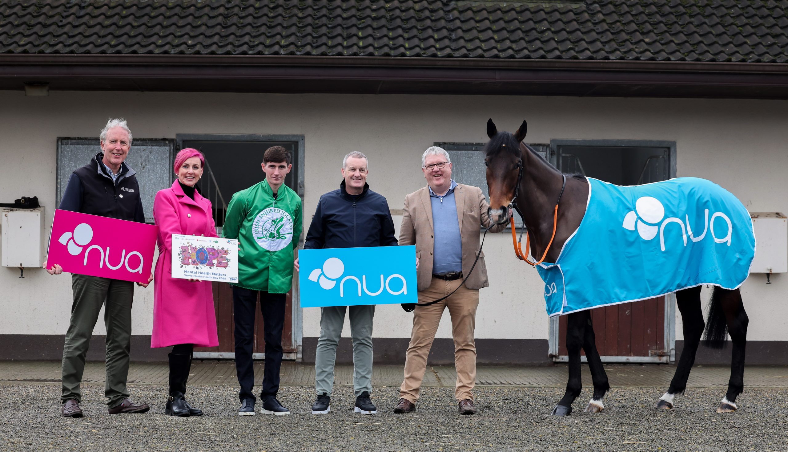 Pictured Left to Right at the launch of Nua Healthcare Services sponsorship at the Curragh Racecourse – Evan Arkwright, Racing & Sponsorship Manager, The Curragh Racecourse; Barbara Brennan, Founder of Mental Health Matters; Ben Coen, Professional Irish Jockey; Noel Dunne, Chief Executive Officer, Nua Healthcare Services; Michael Higgins, General Manager of Irish Injured Jockeys.